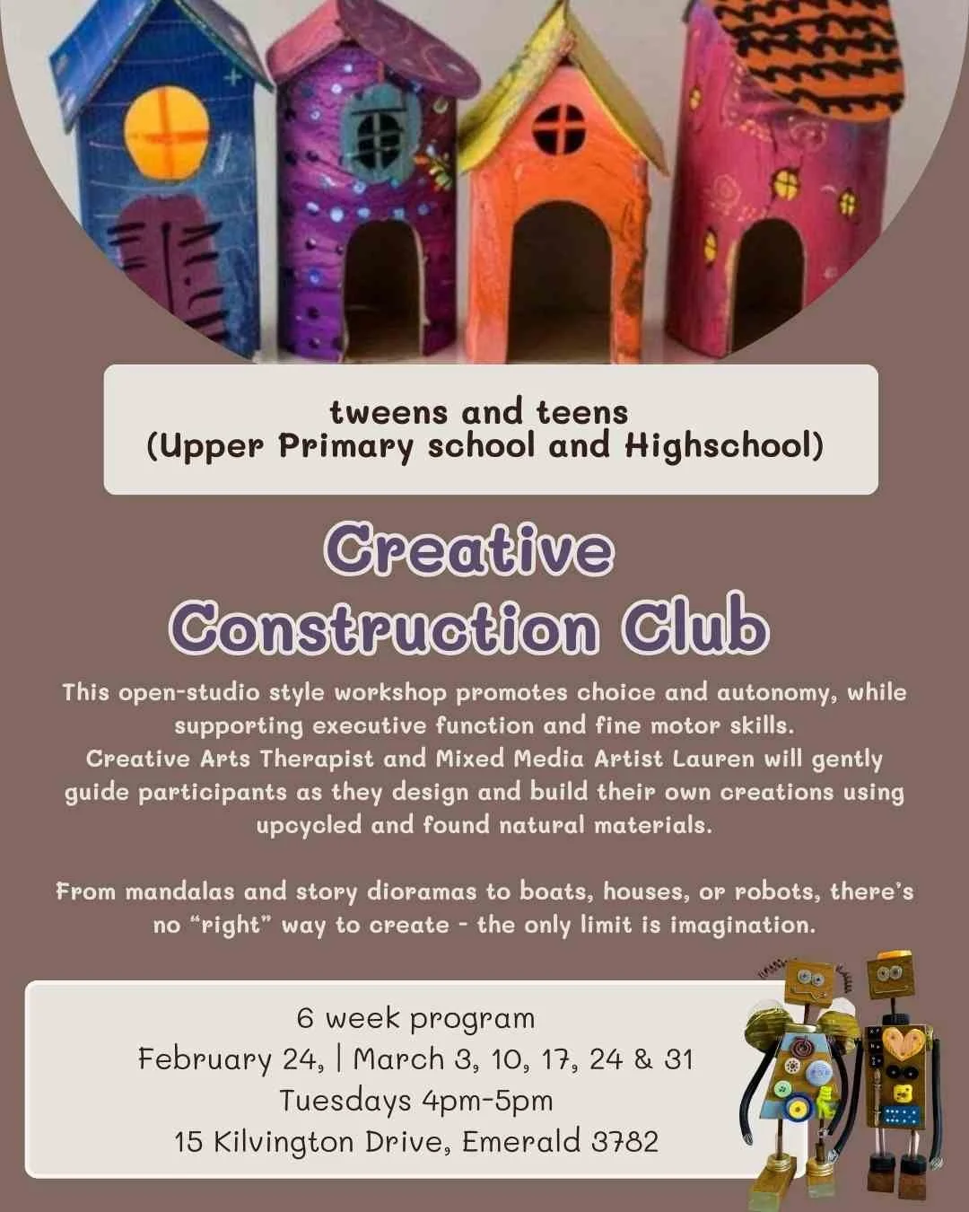 Creative Construction Club is an open-studio style group focused on building, designing, and creating with upcycled and natural materials. This group supports creativity, executive functioning, fine motor skills, and problem-solving through hands-on construction and imaginative making.