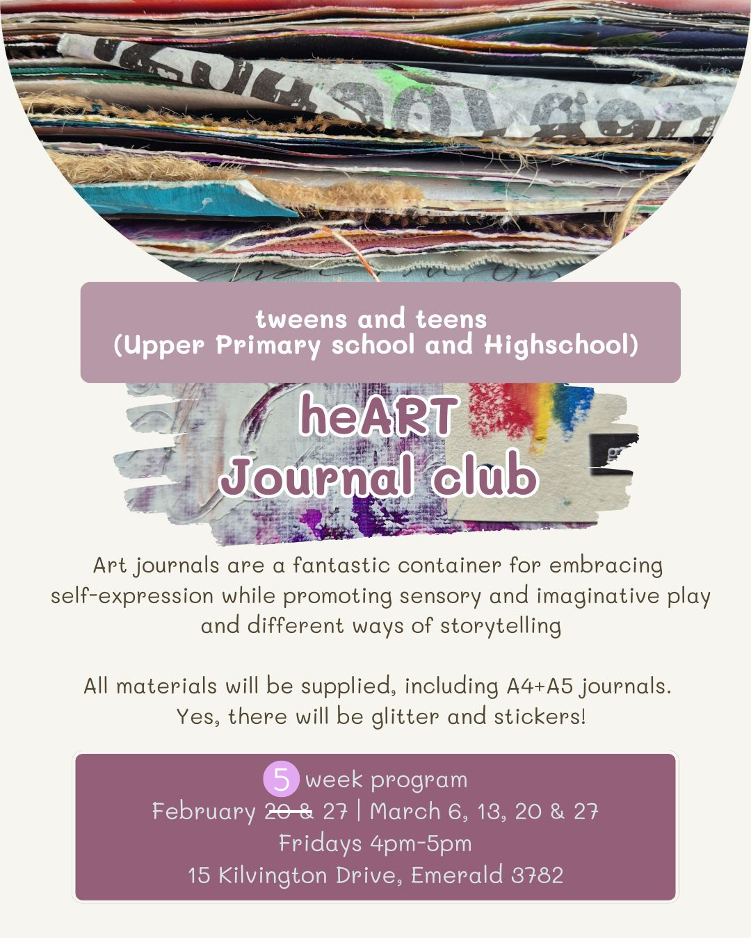 All materials are supplied, with the option to choose an A4 or A5 art journal β and yes, there will be glitter and stickers!